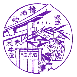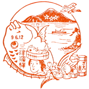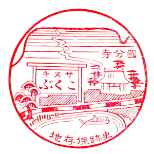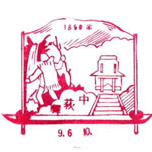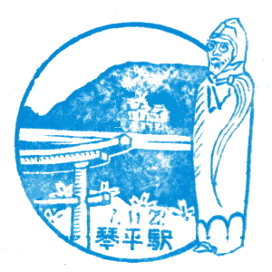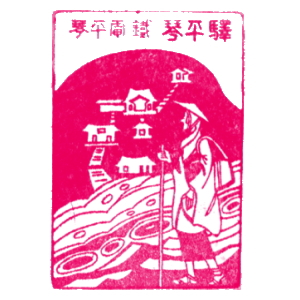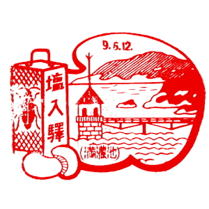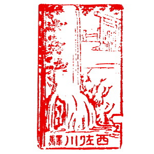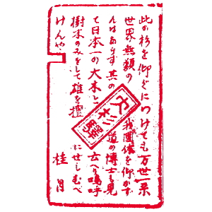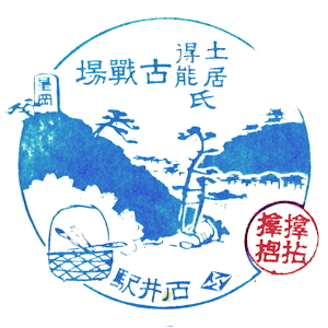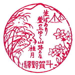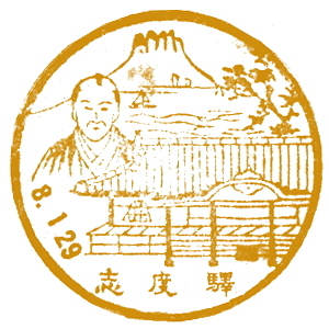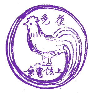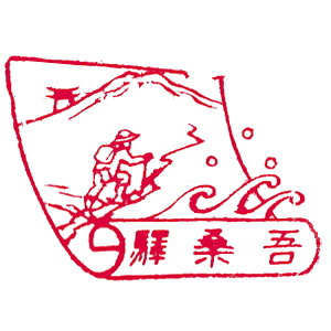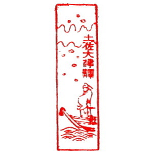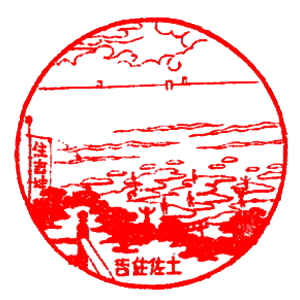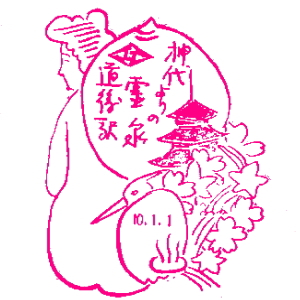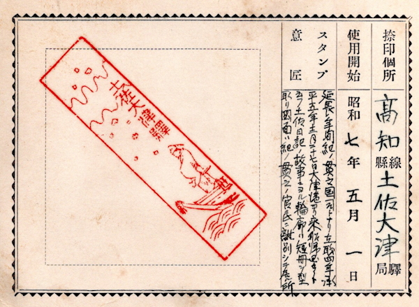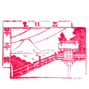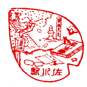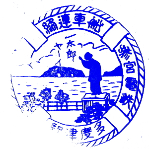 (蔵王帖) 土佐大津駅のスタンプの、蔵王帖の解説を紹介しておこう。 短冊形の超縦長だったため、斜めに押印されている。 描かれている人物は「土佐日記」の作者、紀貫之。 国司として都から派遣されていた人である。 延長年間紀ノ貫之国司トナリ四年、承平五年十二月二十七日、 大津港ヨリ乗船帰京ト云フ土佐日記ノ故事ニヨル。 輪郭は短冊ノ型取リ図案ハ紀ノ貫之ノ官民ニ離別シテ居ル所