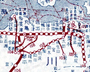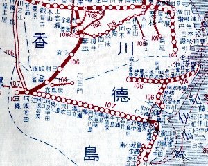 小松島線・徳島本線 小松島港には、大阪・天保山から船便があり、当時の四国の東側の玄関口であった。 ここから小松島線に乗って、徳島へ行く事が出来た。小松島線は、今は牟岐線の一部である。 小松島から南はまだ鉄道が通っていなかった。 徳島駅からは、すでに吉野川に沿った徳島本線が開通しており、終点阿波池田から 予讃線支線(いまの土讃線)に乗りかえれば、多度津の港まで行く事が出来た。 |
