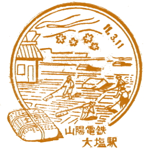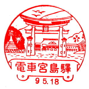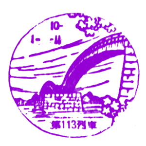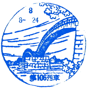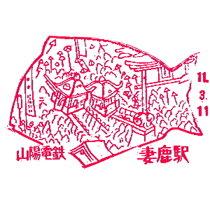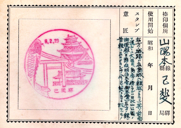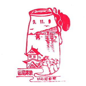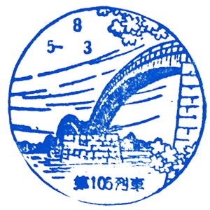 山陽本線には、東京から下関まで行く、富士・さくらという、長距離寝台列車が走っていた。 これらの車内には記念スタンプが設置されていた。当時の最優等列車であり、人々の憧れの列車であった。 その他にも、山陽本線を走る夜行列車は多数あり、記念スタンプが設置されていた。 これらのスタンプには、宮島や錦帯橋が描かれていた。 |