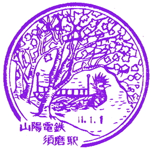 山陽鉄道解散記念スタンプ (江戸川台さんご提供) 山陽本線の線路は、明治21(1888)年に設立された、山陽鉄道という鉄道会社が敷いたものである。 最初は、兵庫〜明石間で開通、徐々に線路を伸ばしつづけ、 下関(当時は馬関)まで開通したのは明治34(1901)年であった。 長距離列車を走らせるため、列車の車両、乗り心地やサービスに力を入れていたという。 しかし国の方針として鉄道は国有化されることになり、 明治39年(1906年)の11月30日、会社は解散した。これはその時の記念はがきに押されていたスタンプだそうだ。 なお、現在の山陽電鉄とは、まったく別の会社である。
