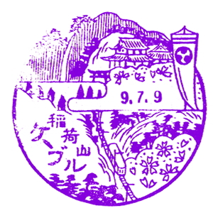 己斐駅のスタンプには、原爆で失われた、広島城天守閣が描かれている。