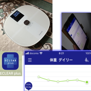 乗ればデータが私のスマホに送られて、すぐにグラフ化して表示される。 「目標体重まであと何キロ!」と表示される。そうか、体重計も進化したんだなあ。 それ以来、毎日体重計に乗るのが日課になった。 出かけられない分、会社の行き帰りにコンビニに寄って、余計なお菓子やおつまみを 買わなくなったので、それだけで少しづつ体重は減ってきた。 2週間ほどの間に2kgの減量に成功した。 |