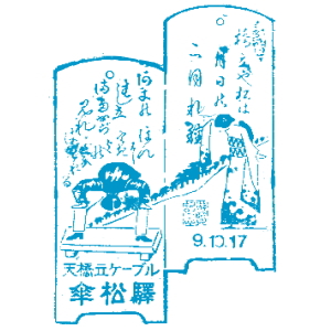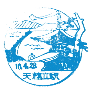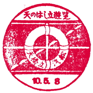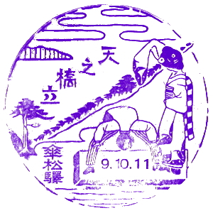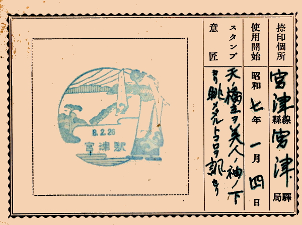 (蔵王帖) 宮津駅のスタンプは、天橋立と美人が描かれ、 当時賑わっていた様子が伝わってくる、良いデザインだ。 蔵王帖の解説を紹介しよう。 美人は股の下から天橋立を覗いたりしないのだな。 天ノ橋立ヲ美人ノ袖ノ下ヨリ眺メタルトコロヲ調セリ