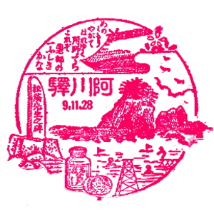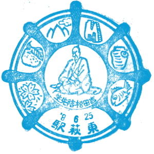 山陰本線は、下関市の幡生駅から延々673.8km、京都に至る長大路線である。 明治時代から、京都から松江方面に向けて順次開通して行った。 では、順に下関側からスタンプを見て行こう。 阿川・長門粟野・人丸と、今は無人駅の貴重なスタンプが続く。正明市駅は、今の長門市駅で、ここから美祢線が分岐する。 長門湯本駅のスタンプを紹介しておこう。実は美祢線の方が、山陰本線より先に開通していたそうだ。 萩・東萩駅を過ぎた、須佐〜宇田郷間が、山陰本線最後の開通区間だったとのこと。 開通したのは1933(昭和8)年で、このスタンプが押されたころのことだ。 益田駅には、小郡から山口線が合流し、さらに東へ。 |