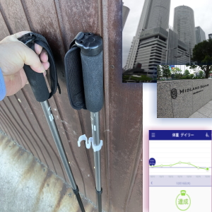 (膝日記) 膝を痛めてもうすぐ2か月、在宅勤務を続けて足の静養に努めた結果、 痛みは弱くなり、家の中なら問題なく歩けるようになった。 そんな時、女房が「これで少し歩いてみたら」とプレゼントしてくれた、2本杖。 これを両手に持って歩くと、一本だけの杖に比べて支える力が強くて安定する。 そろそろリハビリに歩くべき時期の私には、ぴったりである。 |