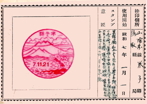 蔵王帖のスタンプ解説を紹介しよう。 美保ヶ関山上より見たる米子市街、伯耆大山の秀峰。 日本海と中海を分かつ弓ヶ浜の五〇に亘る大矢橋。〇〇出入りの船舶。 皆生温泉及び美保ヶ関の灯台を象徴。 |