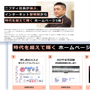 #好きが繋がるプロジェクト  ニフティ社長が選ぶ、インターネット黎明期から  時代を越えて輝くホームページ3選 https://csoption.nifty.com/sukigatsunagaru_pj/feature1/ ものすごく嬉しい誉め言葉とともに、内容や更新頻度が優れている、と紹介して頂いたのだ。 ただ駅スタンプが好きだから続けてきた「押し鉄のススメ」だが、こんな風に評価して頂けりゃ、 そりゃうれしい。 今はSNSが中心で、私の様に個人ホームページを、 HTMLをゴリゴリ書いて続けている人はとても少ない。その辺が「時代を越えて」と表現されたようだ。 ニフティとしては今後も、個人ホームページのサービスは続けるとのことなので、 ぜひ今後もよろしく対応願いたい。 |