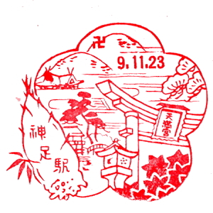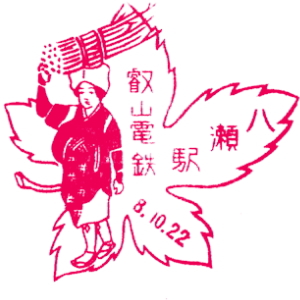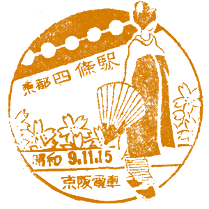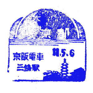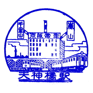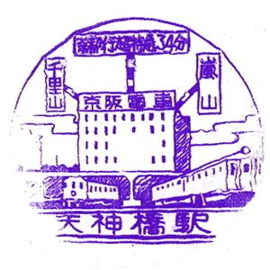 | ここで紹介するのは、戦前の京阪時代のスタンプである。 天神橋駅は今の天神橋筋六丁目駅。花壇前駅は、北大阪電気鉄道・千里線の駅。 その後京阪を経て阪急の路線となった。今の阪急千里線・関大前駅である。 嵐山駅は、新京阪線の支線として1923(昭和3)年に開業した。 最後のスタンプは、1931(昭和6)年に開業した京阪京都駅、今の大宮駅である。 |