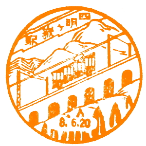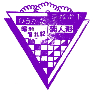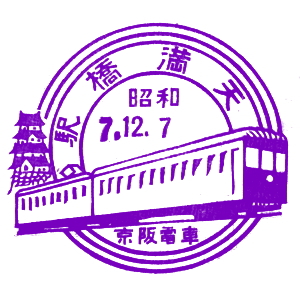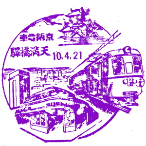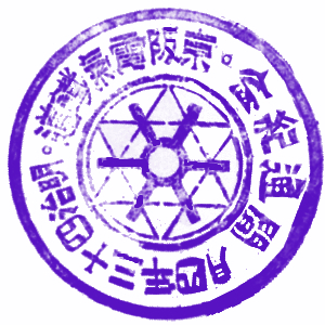 京阪線開通記念スタンプ (江戸川台さんご提供) 京阪電気鉄道は、かの渋沢栄一を設立委員長として、1906(明治39)年に設立された。 それから4年後の1910(明治43)年に、今の京阪本線を開業したが、その時の記念はがきに、 記念スタンプが押されていたそうで、江戸川台さんから印影を頂いたので、紹介しておこう。 駅スタンプが出来る以前から、日本では各地の絵葉書に良くスタンプが押されていた。 これもそのうちの一つの、貴重な印影である。