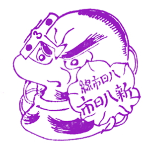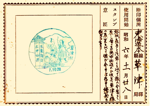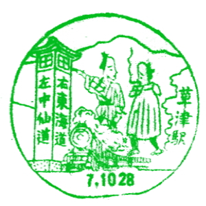 (蔵王帖) 東海道は、江戸時代に多くの旅人が行き交った街道である。 その旅の雰囲気を感じられるのが、草津駅のスタンプ。 膝栗毛の弥二さん・喜多さんとSLが描かれている。 蔵王帖の解説を紹介しておこう。