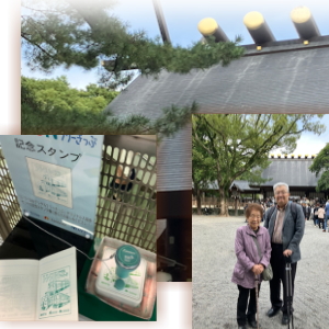 広い熱田さんの杜の参道を歩いていく。今日はちょうど七五三の時期でとても賑わっている。 小さい子が大好きな母は、着物で着飾った女の子に何度も「可愛いねえ綺麗だねえ」と声を掛けている。 「膝が良くなるように」と願いを込めて参拝する。人に頼んで神宮の前で記念撮影。お守りを買っていこう。 母には長寿のお守り、自分用には男守り。 |