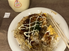 大人気で、入店するには列に並ぶ必要があったが、なんとか席を確保した。注文した「そば肉玉」のお好み焼きが