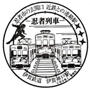 |   | 鉄印帳・東海版・其の13 伊賀鉄道 (上野市駅) さっそく窓口で頼むと、いくつかバリエーションがあるようだったが、 一番シンプルなものを下さいと言ったら、左の鉄印になった。 この伊賀市駅、忍者市駅と言う別名も持っており、その鉄印もあったのだが、 そちらにしておくのが正解だったかもしれない。ともかくこれで東海版の鉄印、完集である。 この伊賀線は、初代の伊賀鉄道が1916年(大正5年)に、関西本線・伊賀上野駅と上野町駅(今の上野市駅) の間で開業させた。1922年(大正11年)には、今の伊賀神戸駅まで開通した。 その後近鉄の傘下に入り、長く近鉄伊賀線だったが、2007年(平成19年)に経営合理化のため、 新たに今の伊賀鉄道という別会社が作られて、運営を引き継いでいる。 |