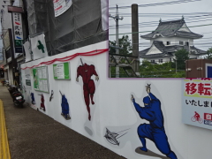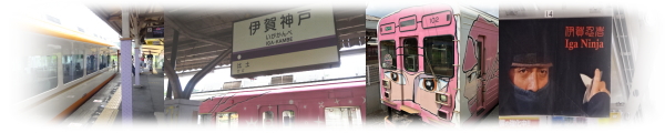 | 伊賀は忍者の里。それを地域をあげてPRし、観光客を呼び込んでいる。 忍者は外国の人にも人気なので、インバウンド需要をうまく取り込んでいるのだ。 乗り込んだ列車も、忍者のラッピングがされている。ピンク色で、 列車の先頭には、女忍者「くのいち」の顔が描かれている。ずいぶんまつ毛が長いが、 これはかの松本零士氏のデザインだからだ。私の年代の人には、メーテルや森雪を想起させる。 車内のも忍者の絵が多い。吊り広告にさえ、忍者が出現していた。 |