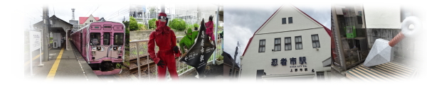 (伊賀鉄道) あみま倶楽部ラリー印 伊賀鉄道の車窓は、のどかなものである。水田が、盆地に広がっている。 今年は米が高くて大変である。このまま無事に、実りの秋を迎えて欲しい。 上野市駅に12:02着。ここが伊賀の中心の町である。 一歩ホームに降りれば、駅のあちこちに忍者が立っていたり、潜んでいたり、 手裏剣が刺さっていたりする。凄い観光PRへの力の入れようである。 |  |