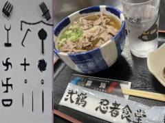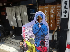 という所があるらしいので、行ってみよう。 店の前には忍者の顔出し看板がある。これは子供は楽しいだろうなあ。さっそくお店の扉を開けようとしたが、 ドアノブが無い。黒い頑丈そうな扉だが、これはスライドさせる引き戸なのかな?、 あれ、でも手を掛けるところもないぞ、どうなっているのだ? 困って片側を押してみたら、扉は真ん中を中心に90度回転して開いた。 うわっこれ、忍者屋敷にある隠し扉の構造じゃん! 店の中には手裏剣をはじめ、忍者が使う武器が壁一面に飾られておる。なるほど「忍者食堂」だ。 伊賀牛を使っているという、肉うどんがあったので注文。肉が柔らかくてとても美味しかった。 |