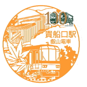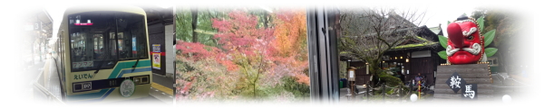 (叡電) エキタグ・100周年バージョン 宝が池のあたりから北に進むと、周りの山々の美しい紅葉が楽しめた。紅葉のトンネルという名所では、 アナウンスが入ったり、列車のスピードを落として進んでくれた。14:17、鞍馬駅着。 前に来たのはいつかなと調べてみたら、13年も前だった。時が過ぎるのは本当に早い。 今日も相変わらず駅前には、立派な鼻をした天狗の、巨大なお面が鎮座していた。 スタンプとエキタグを押しているうちに、折り返しの列車は行ってしまったので、 次の14:34発の電車で戻ることにした。やってきたのは、叡電が誇る紅葉観光用車両、 「きらら」であった。 |