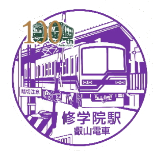(叡電) エキタグ・100周年バージョン 14:51発の電車で、山を下りていく。あと一か所、今日は叡電で寄って行きたい駅がある。15:17 修学院駅着。 ホームでスタンプとエキタグは押したけれども、さらにもう一つ、ホームから数段階段を上がったところにある、 叡電の事務所に寄っていく。ここに100周年のスタンプが設置されているらしいからだ。 ただ押してみたら、下の様なスタンプであり、本来は観光列車「ひえい」を印刷した台紙ハガキの上に押すものだったらしい。 それを知らず、ちょっと残念なスタンプで終わってしまった。 |