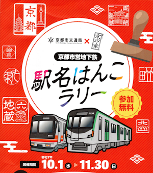 | 今日参加するスタンプラリーは、「京印章駅名はんこラリー」という。 10月1日〜11月30日まで行われている。 京都市営地下鉄と、京都府印章業協同組合がコラボして実現した。 全31駅に「駅名はんこ」が設置されているという。 |