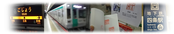(京都市営地下鉄・烏丸線) 京印章・篆書体/漢印篆・京都インバン(株) 8:13、インバウンドの外国人の姿も多く、混雑する京都駅のホームから、地下鉄烏丸線に乗る。 一駅北に進み、すぐ五条駅に到着、8:15。平安京の条里制では、北から南へ一条、二条、そして十条と、東西の街路が作られた。 その名残の駅名の、五条駅だ。京都地下鉄には、条のつく駅が4つある。駅名はんこを押してみる。いかにもはんこ、という感じの文字だなあ。 京都の地下鉄の駅にはエレベータが完備されているので、 膝を痛めている私には、とてもありがたい。次の電車に乗って、8:25 四条駅着。 |