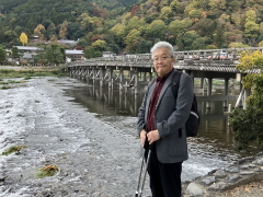 | 久しぶりの嵐山駅なので、いくつか新しいスタンプを押せたが、ここではこの、 ベビースターラーメンを販売している、おやつカンパニーと嵐電がコラボしたスタンプを紹介しておこう。 今、嵐電3駅で、このコラボスタンプが押せるので、集めて行こうと思う。 混雑する嵐山駅を出て、渡月橋まで歩いてみた。今日は定日なのでマシなのだろうと思うが、 それでも観光客は多い。20人ぐらいの外人グループ旅行客が、 外人ガイドさんが降る旗について行列している。渡月橋の所でガイドさんが英語で案内をしている。 この光景は昔、日本人の海外旅行の定番スタイルだったと思うが、時代は変わったものだ。 |