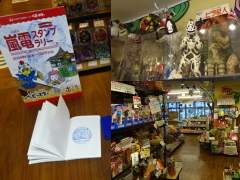 10:28の嵐電の折り返し電車に乗り、10:41 帷子ノ辻駅へ。 この駅の二階に、映菓座という、 ぜひ寄って行きたいお店がある。「映画の街の駄菓子屋さん」ということで、懐かしい昭和の駄菓子やおもちゃが所狭しと並んでいる。 昔私も持っていたビニール製の怪獣の人形や、宇宙戦艦ヤマトのプラモもある。ここは映画会社の松竹がプロデュースしているのだそうだ。 おやつカンパニーコラボスタンプはここに置かれている。スタンプを集めるともらえる商品は、ベビースターラーメンであるらしい。 |