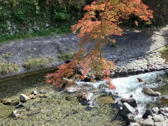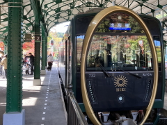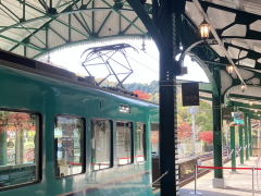 (叡電) エキタグ・100周年バージョン 改札を出ると、比叡山につながる山や川の自然が目の前である。 今日は紅葉が特に鮮やかで、来てみて良かったなあと思った 駅スタンプとエキタグの、新しいのを押して行く。描かれているのは、 叡電が誇る観光列車「ひえい」、2018年にデビューした。 前面には縦に楕円の大きな飾り、側面は丸窓が並ぶ独特なフォルムで人気が高い。 スタンプを押していたら、その「ひえい」がホームに入線してきた。次の電車は「ひえい」らしい。これはラッキーだ、私は喜んで乗り込んだ。 |