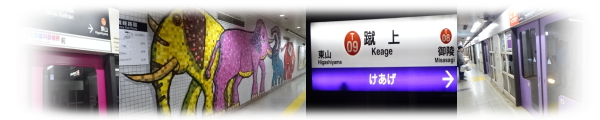 (京都市営地下鉄・東西線) 京印章・篆書体・小泉湖南堂 次の電車に乗り、12:08、蹴上(けあげ)駅着。 この珍しい地名は、源義経が奥州に向かった際、すれ違った美濃の武士が水を蹴り上げ、 義経の衣を汚してしまい、争いになったことに由来するそうである。 そんな小さなエピソードが今の地名に残っているのが、いかにも京都らしい。 京都市動物園の最寄り駅で、駅の壁には動物をモチーフにした壁画が並んでいた。 それを眺めつつ、駅名はんこの設置場所へ。 駅名はんこは、菱形の枠を中に入れて変化を持たせたデザイン。 |