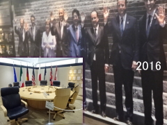 (賢島駅内) ISESHIMA-SUMMIT-2016 あと、今日の賢島駅には、もう一つ見ていきたい場所がある。 駅舎2階に作られた、伊勢志摩サミット記念館・サミエールである。 この賢島でG7サミットが開かれたのは、2016年、9年前のことだ。 階段を上がっていくと、入口に当時のG7首脳の等身大記念写真が飾られている。 不幸にして亡くなった安倍首相に、米・オバマ大統領、独・メルケル首相も居る。 この顔ぶれを見ると、今はみんな変わってしまったなあ、と思う。 |
