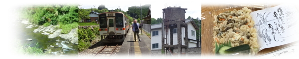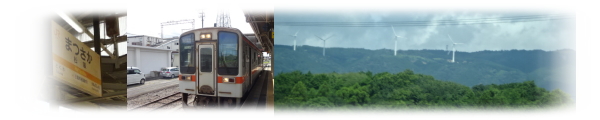 | 9:38発の名松線、伊勢奥津行きに乗車する。一両だけの気動車キハ11は、 松阪の街を離れてのどかな田園地帯を行く。 北に見える青山高原の山に、風力発電の風車が見える。 昔々、KK氏と二人、あの山の上を自転車ツーリングしたことがあるので、 さっそくその昔話に花が咲く。35年ぐらい前の事であり、あの時はあんな風車は一つもなかったよな。 |