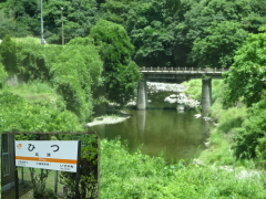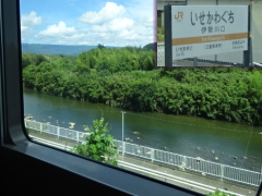| 再び渓谷美の中を行く。ただちょっと開けて街になっているところもあり、 山から切り出した木材が大量にまとめて置かれている。ここが美杉町の中心部で、 停車した伊勢八知駅が最寄り駅だ。ここは平日しか駅の窓口が空いていないので、 駅スタンプを押すため、以前に一度、平日に訪問した。 |