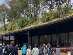 今、太宰府天満宮の本殿は修理工事中で、手前に仮殿が立っている。この仮殿も、有名建築家・藤本壮介氏が設計した独特のもので、なかなか趣がある。