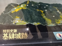 駅を離れて少し登り、基山の麓にある、基山町民会館に立ち寄る。ここで、続日本100名城のスタンプが押せる。 それと、基肄城の立体模型があったので、じっくり眺めた。これは、ただならぬ山城の様だ。基山の一つの谷筋を石垣で遮断して閉じ、 そこから尾根に沿ってぐるりと一周、防塁を築いている。その長さ4kmあまり。城の内側に大きな倉庫をいくつも建てて、武器や食料を蓄え、 長期の籠城戦に備えることができるようになっている。 |