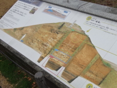 | 実はこの緑の帯が、1400年前の飛鳥時代、国を守ろうと決死の思いで作られた、長大な防塁なのである。 古代の人々は土を突き固め、これを作った。切通部分には、防塁の断面構造がわかるよう、展示と説明が行われている。 防塁の前後には、幅の広い水堀が作られていたそうで、その姿から、水城(みずき)と呼ばれた。 一体どうして、こんな施設が必要になったのだろう。 |