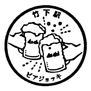 (鹿児島本線) ビアジョッキ まずは城巡りの目的地の最寄り駅に行くまでに、最近設置された未押印の駅スタンプも押して行くとしよう。 7:12発の鹿児島本線、二日市行きに乗り、わずか3分。7:15、竹下駅で下車する。線路の向こうの留置線に、 JR九州が誇る豪華列車「ななつ星in九州」が停まっていて、驚いた。 数年前に設置され、私が未押印だったスタンプは、ビールで乾杯している図柄。 この近くにアサヒビールの工場があったからなのだが、最近移転してしまったそうだ。 |