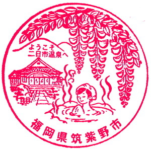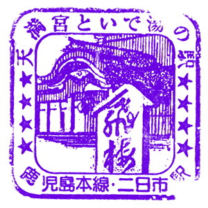 (鹿児島本線) ようこそ二日市温泉へ 若き日に自転車で南九州を目指して走った、 思い出の国道3号線を懐かしく進み、基山駅に戻った。 レンタサイクルを返却すると、11:00少し前だった。午後はせっかくだから、太宰府天満宮にお参りして行こう。 11:00の博多行きに乗り、二日市駅に戻ったのは11:16。観光案内所に寄ったら、こんなスタンプを押す事が出来た。 ここには温泉もあるのか、知らなかったなあ。 |